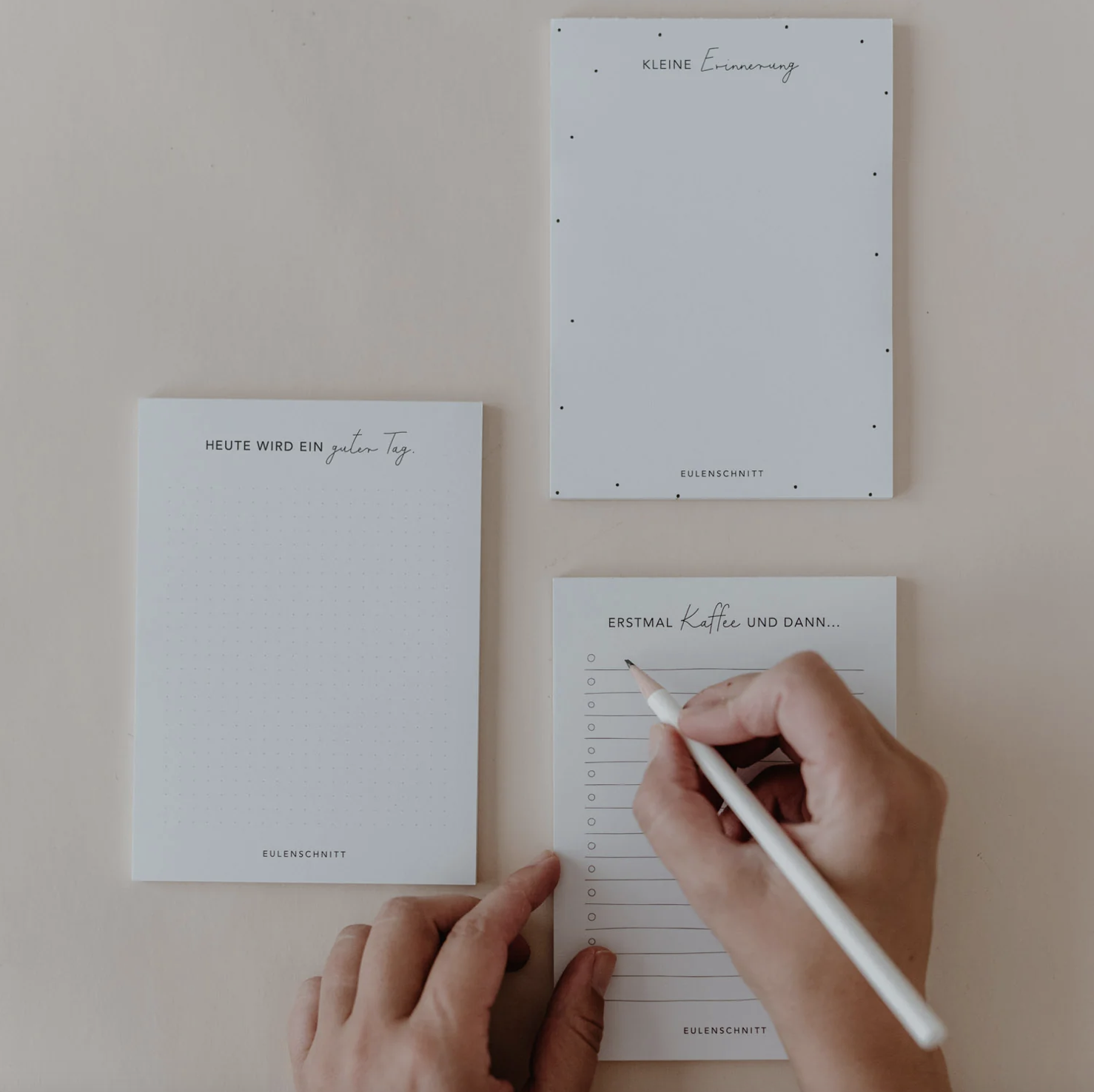 Besonders am Montagmorgen ist der Arbeitsmodus vielleicht nicht ganz auf Hochtouren und genau deshalb braucht es kleine Motivatoren! Mit seinen Kartenständern, stilvollen Stiften oder minimalistisch gestalteten Notizblöcken verpasst Eulenschnitt dem Schreibtisch ein stilvolles Make-over, der ungeliebte To-dos plötzlich viel angenehmer macht.